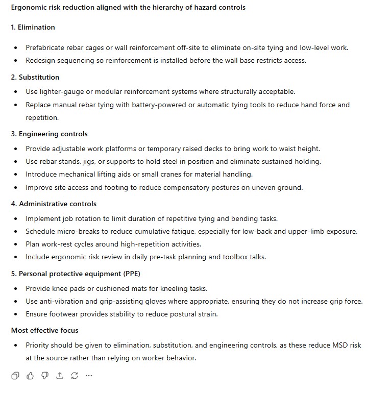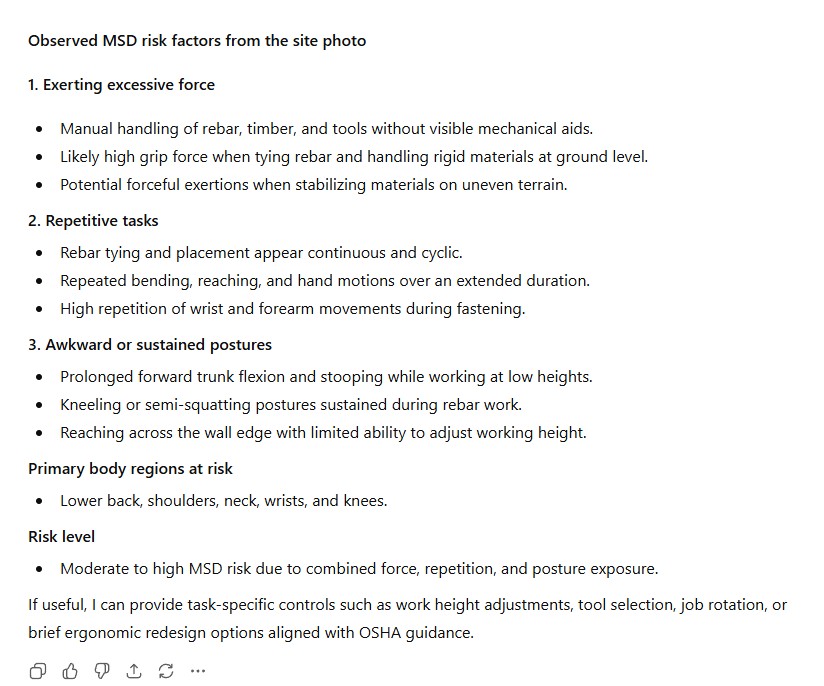 What you can’t see in the bottom dialogue box is the rest of OSHA’s MSD risk factors and our request that AI suggest ways to reduce the risk of injury that align with the hierarchy of hazard controls.